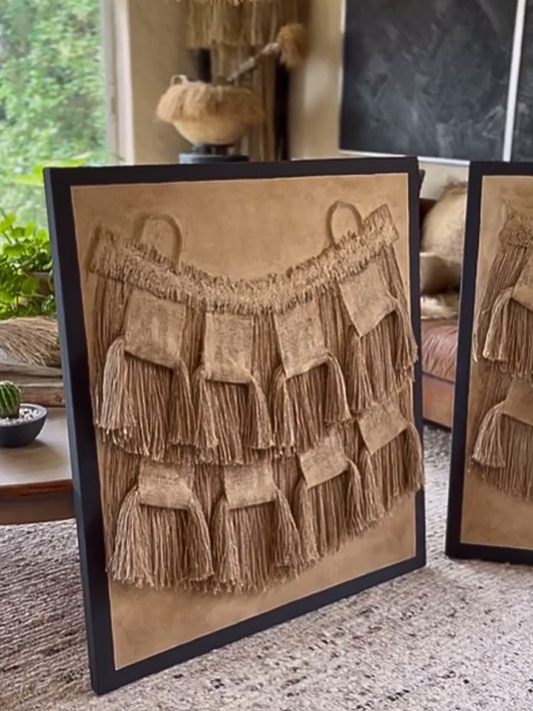 La obra comienza con un tejido artesanal en yute y cuerdas, creado como símbolo de unión y protección. Este amuleto es el corazón de la pieza.